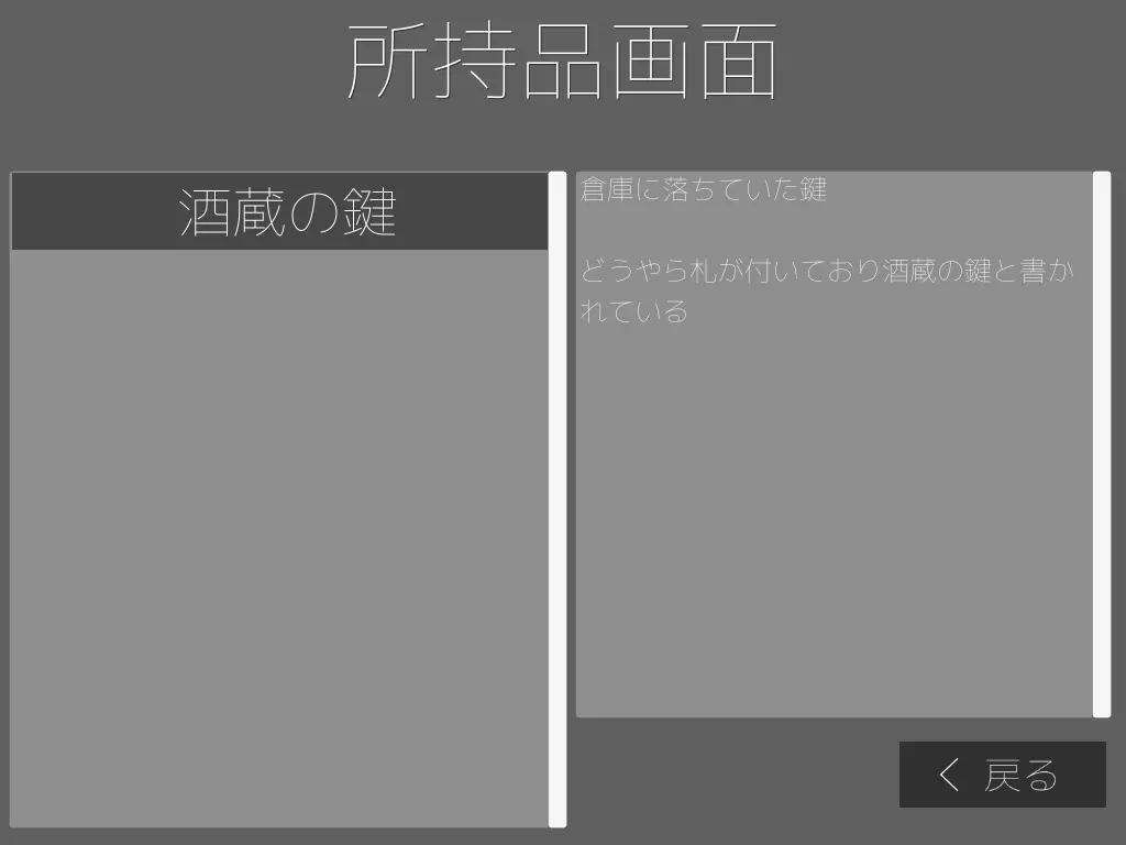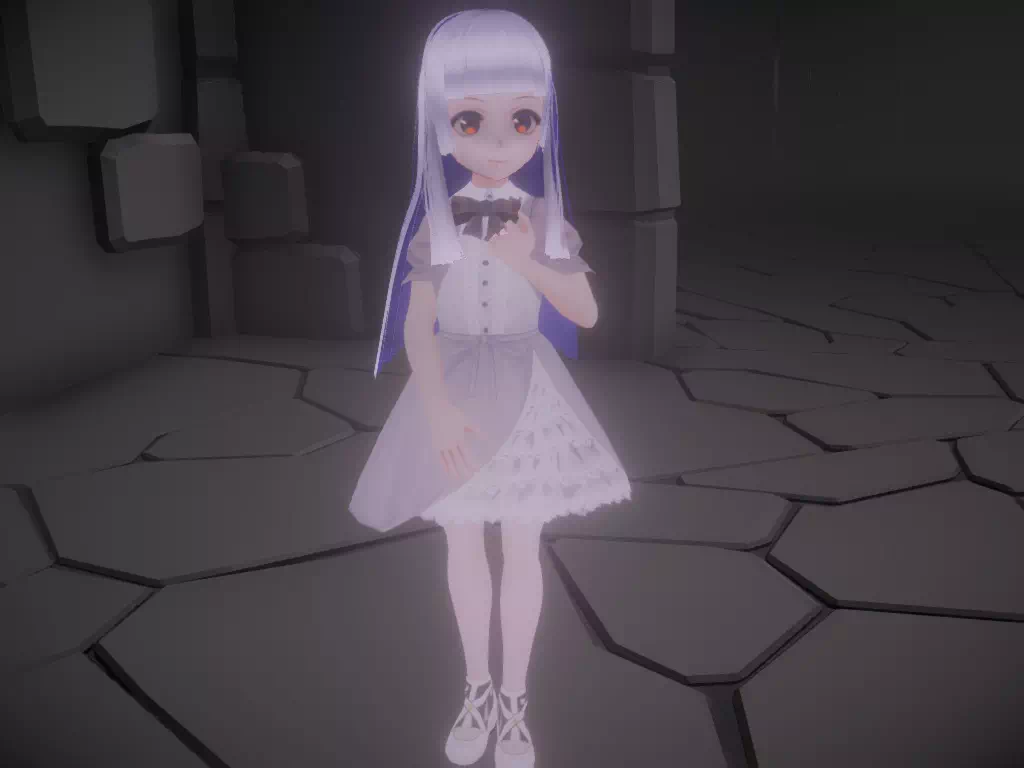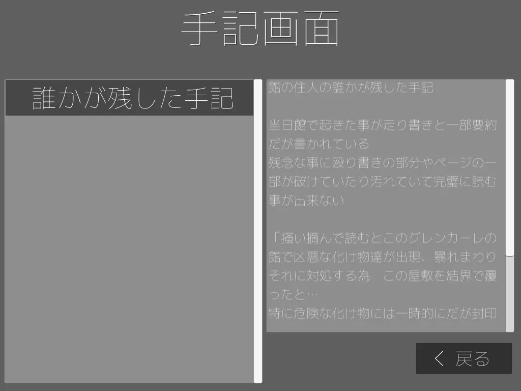 ゲーム中の流れ ここでは簡単にゲームの流れを画像等を使って説明しています。 一部開発中の画像があります。 追跡者 一定のイベントをクリアすると出現する敵 主人公とイオを執拗に追い回して攻撃してきます。 なお、主人公およびイオのHPが0になり殺されるとBADENDとなります。 HPを回復する手段が用意されていないので慎重に進みましょう。 館の探索と謎解き 上記の追跡者の追跡を避けつつ、館を探索していくのが基本となります。 館の探索中に下記のような光るエフェクトがあり、そこでアクションすると アイテムや館で何が起きたのか記されたノート等を拾うことが出来ます。 館の探索中に施錠された扉などがあり、対応するカギを探して開けましょう。 また、館に施されている封印等を解除して3階を目指しましょう。 封印を維持しているアイテムを取ったりする事で先に進めます。 探索している最中に下記のような場所がある事があり、この場所は 特殊なアイテムや下準備を整えてから近寄り、アクションを行いましょう そうすれば何事も無く通れるはずです。 そうして館の謎を解き明かしつつ先に進めばこのような光輝く物と出会うでしょう。 これはイオの魂の欠片であり、4つに分割された、欠片を館内を探索して見つけましょう。 そして最後に行き着く場所が3階の… この場所となるでしょう 全ての魂の欠片を集めこの場所へ向かい、アクションを行うと… この先は貴方が見てください… この悲劇の物語の結末を…