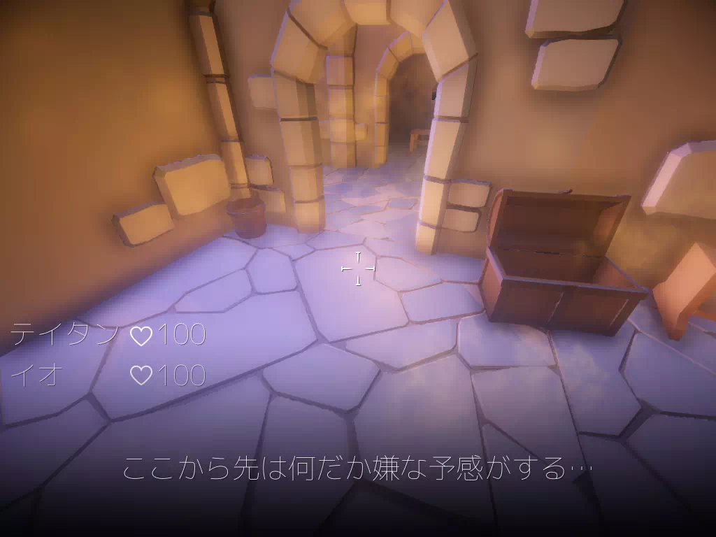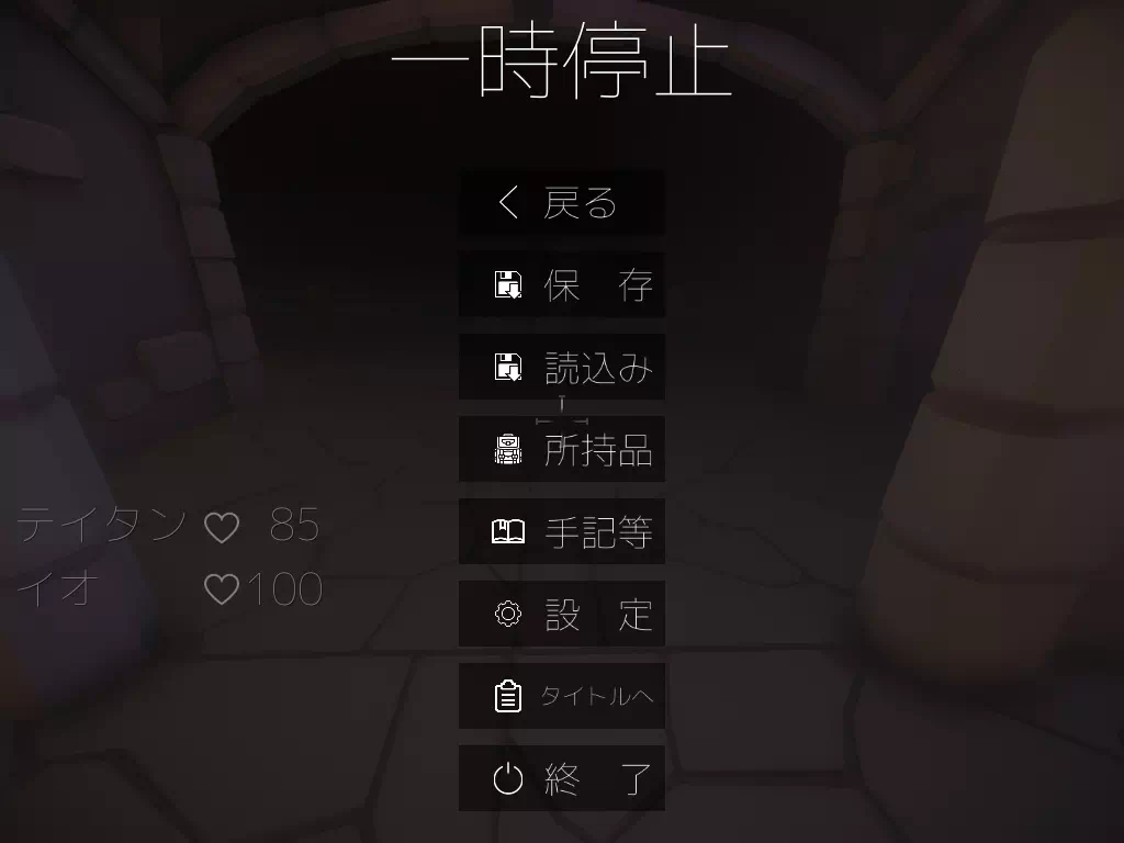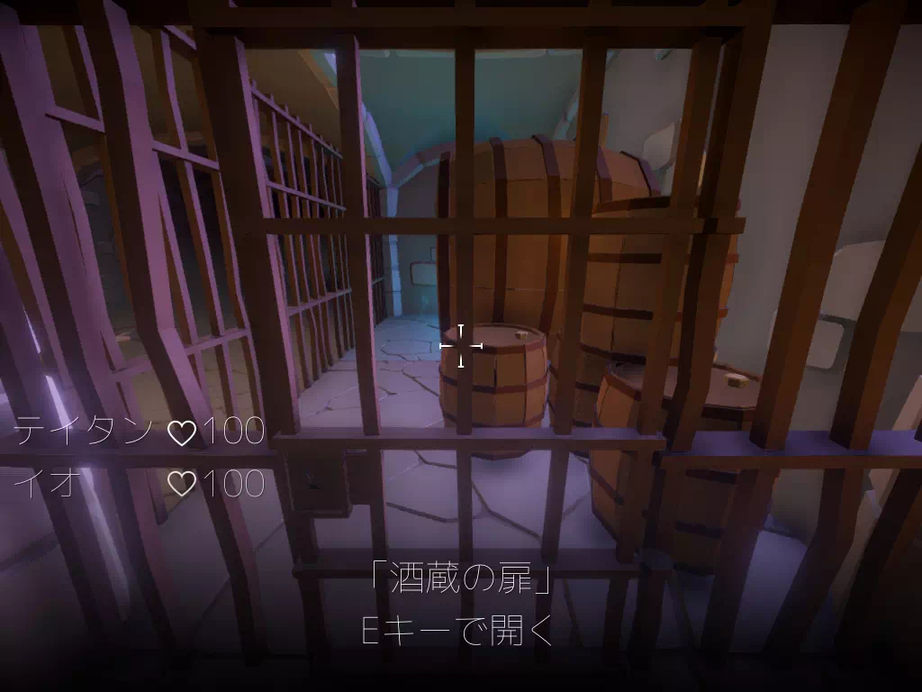 システム ここではゲームのその他システムに関する情報を記載しています。 一部開発中の画像があります。 HP HP、テイタンかイオのHPが0になるとBADENDとなるので両者のHP には常に気を払いましょう。 HPを回復させる方法が存在しないので慎重に進んでください。 赤い光のエフェクト 館で起きた事を記したノートや攻略のカギとなるメモなどを 拾う事が出来ます。 青い光のエフェクト アイテムを拾ったり、何かを動かしたりできます。 施錠された扉 対応するカギを拾う事で扉を開けることが出来ます。 なお、館では幾つかの施錠された扉が存在します。 結界 この結界がある限り先に進むことが出来ません。 封印の維持している物を取る事で封印を解除する事が出来ます。 また、追跡者等も同じく通る事が出来ません。 特別なオブジェクト 光り輝くエフェクトのあるオブジェクトは一部結界を維持するための 物で取る事で結界を解除出来ます。 嫌な予感のする場所 一部怪しい煙が立ち込めている場所が存在します。 ここに近寄ると「ここから先は何だか嫌な予感がする…」と表示が出ます。 この場所に何の準備やアイテム等持たず不用意に近づきすぎると 悲惨な結果が待っているでしょう… 魂の欠片 イオの砕かれた魂の欠片 館内に4つに分割され何処かに隠されている。 回収するとイオに吸収され、イオの一部記憶等が戻る事で 魂レベルが上がる。 魂レベル イオの砕かれた魂の回復度合い イオの魂の欠片を集める事で魂レベルが上がる。 それによりイオが記憶を取り戻し、人間味を取り戻す。 死体 元はこの館の住人や行方不明だった村人の死体 近くに寄ると名前や簡易プロフィールや死因が表示されます。 イオが近くに寄ると魂レベルに応じて様々な反応を返してくれます。 儀式で使われた魔法陣 この魔法陣が全ての元凶 魔法陣は光り輝いているが、今は一部書き換えられ 現在は効力を失っている。 ??? 最後にたどり着く場所にある 優しく温かい感じがする。