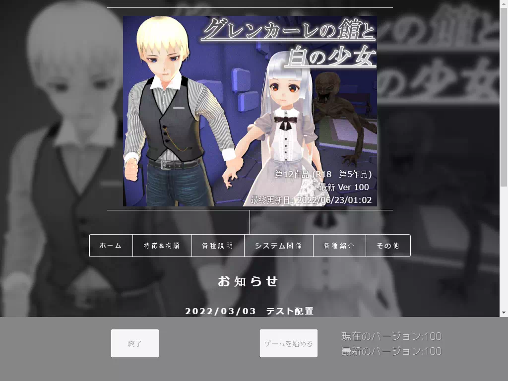 画面説明 ここでは各種画面に関する操作や説明を記載しています。 一部開発中の画像があります。 WebMenu(シリアルキーの入力初回のみ イベント配布版のみ) 初めてのゲーム起動時にこのシリアルキー入力画面が表示されます。 ゲーム購入時に記載されている、8文字の英数字で構成されるシリアルキーを入力し、送信ボタンを押してください。 *注意 購入先などによって表記方法、および場所に違いがあると思うので購入ページの説明をよくお読みになってください。 同人イベント等ではDLカードにダウンロードURLと共にシリアルキーが記載されています。 DL時のシリアルキーとゲーム起動時のシリアルキーは共通なので無くさないようご注意してください。 また、シリアルキーの大文字、小文字なども識別するので正確に入力してください。 正しいシリアルキーで正常にサーバーと通信が出来ればお知らせのHPが表示されます。 *注意 ネットワークに接続されている必要があります。 認証サーバーとの正常な通信が出来ない場合に表示されます。 ネットワーク通信が出来ない場合や不安定で正常な通信が出来ない場合にも表示されます。 また、認証サーバーがダウン等の障害が発生している場合にも表示されます。 他のウェブサイトを正常に開けれるか通信環境の確認、またはお知らせを見てください。 しばらく時間を置いて再度ためしてみてください。 シリアルキーが間違っている場合などはこの画面が表示されます。 また不正なシリアルキー、正規のシリアルキーでも不正に利用された場合、この表示が出る場合があります。 再度シリアルキーを入力してください。 入力回数制限、時間制限などはございませんので落ち着いて入力してください。 原則として、srから始まる8文字の英数字で構成されています。 この画面はライセンスキーが破損しているか、お使いのシリアルキーが不正利用等された場合に表示されます。 この表示が出た場合はゲームが出来ない状態となります。 正規の購入者が2台以上の別のPCにインストールした場合や再インストール後の起動時にも同様に表示されます。 複数のPC環境等で遊びたいという方は申し訳ないのですが、台数に見合った数の購入を検討してくいださい。 正規で購入されたのにこの画面が表示されゲームが出来ない場合、別途対応させていただくので誠にお手数ですが、こちらの掲示板に記載、またはツイッターNot! オレキュア5!に連絡してください。 またほぼ個人でやっているサークルの為に対応に時間を要す場合がありますが、ご了承ください。 別のPCに移したい場合は最初にインストールし、認証したPCの「Not! オレキュア5!\MagicGirl Field」フォルダ階層にある「license.dat」ファイルを新しいPCの同じ場所にコピーする事でゲームを遊ぶ事が出来ます。 下記画像を参考にファイルを見つけてください。 WebMenu ゲーム起動時にこの画面が表示されます。 正常にネットワークに接続されていると、画面中央にお知らせのHPが表示されます。 ゲームの現在のバージョンと最新のバージョン番号が表示されます。 画面中央下部に「始める」でゲームが開始出来ます。 このボタンは更新がある場合に「ゲームの更新」に切り替わり、自動で更新します。 左下の終了でゲームを終了。 タイトル画面 何かキーを押してくださいの表示後、何かキー入力を入れるとこの画面が表示されます。 左1番目の「最初から」ボタン ゲームを始めます。 左2番目の「続きから」で保存したゲームの続きより開始 左3番目の「設定」で各種ゲーム設定変更 左4番目の「終了」でゲームを終了します。 設定画面 この画面ではゲームの各種設定を変更します。 「解像度」ゲーム画面の表示サイズを変更します。 「画面モード」ウィンドウかフルスクリーンでの表示方法を変更します。 「品 質」表示画面の品質を変更します。なお、品質を上げるほど描画負荷が掛かるので動作が重い場合などは品質を下げてください。 「BGM音量」BGMの音量を変更します。 左端で一番小さい値、右端で最大値です。 「SE音量」効果音の音量を変更します。 左端で一番小さい値、右端で最大値です。 「マウスの感度」マウスでの視点操作の感度を変更します。 左端で一番小さい値、マウスでのカメラの速度が遅くなります。 右端で最大値で、マウスでのカメラの速度が速くなります。 「初期値に戻る」 各種値を初期値に戻します。 ゲーム中 画面左下のテイタンと表示のある横の数字が主人公のHP表示です。 その下段がヒロインであるイオのHP表示となります。 両者どちらかのHPが0になるとBADENDとなります。 一時停止メニュー ゲーム中にキャンセルボタン(ESCキー)を押す事で表示される画面 またこの時はゲームが一時停止されており、追跡者は止まった状態です。 「戻る」一時停止を解除してゲームに戻ります。 「保 存」セーブ画面を開きます。 「読込み」ロード画面を開きます。 「所持品」所持品画面を開きます。 「手記